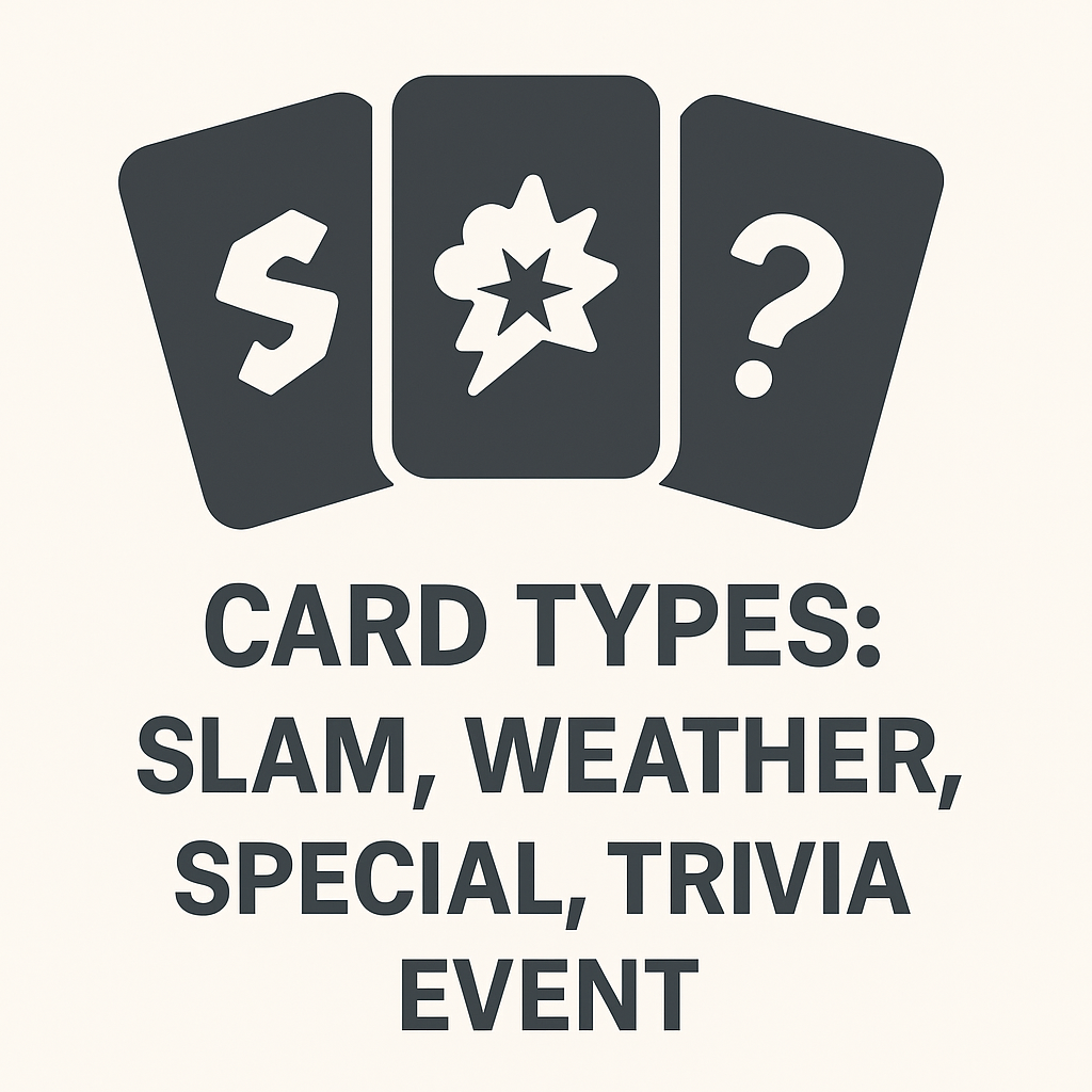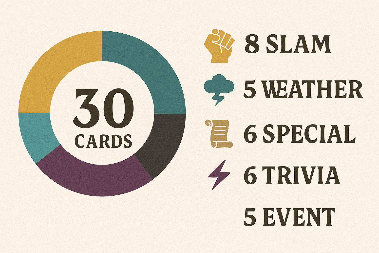 Each card type is carefully balanced to deliver tactical variety—powerful slams, mythic weather shifts, surprise events, and lore-based challenges await seasoned players.